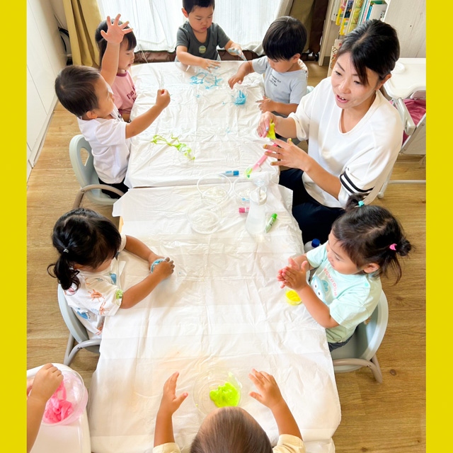スライム作りをしました(^^)混ぜたり伸ばしたり、プニュプニュの感触も感じながら楽しんで遊べました(๑˃̵ᴗ˂̵)